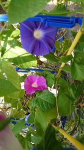 青色のアサガオは時間の経過とともに、紫色に変化していくのが不思議です。